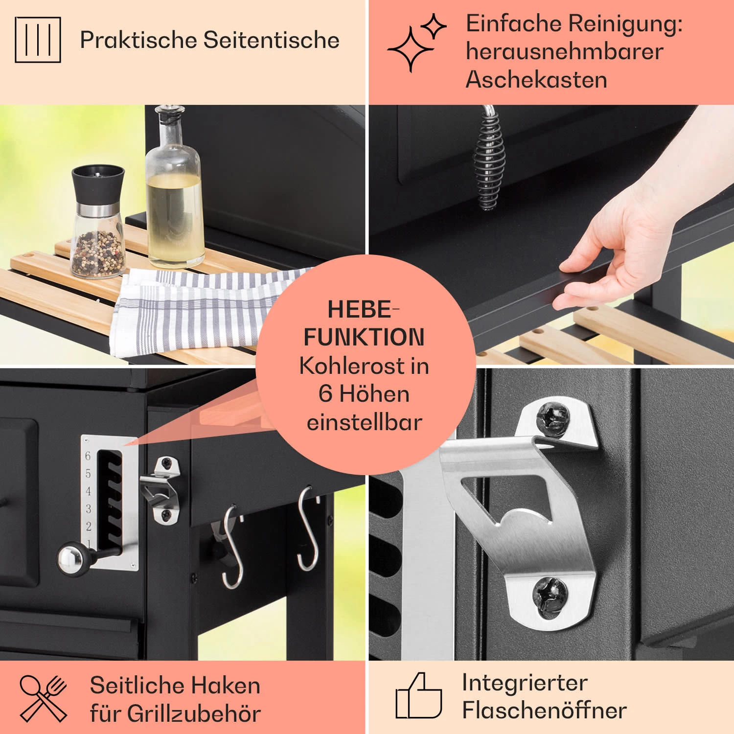 Erlebe maximalen Grillkomfort und ideale Hitzeverteilung: An der vorderen Frontklappe kannst du das Feuer sicher und komfortabel schüren und jederzeit bequem nachlegen. Die gesamte Feuerkammer kannst du dank einem einfachen Mechanismus beliebig heben und senken, damit dein Grillgut jederzeit in perfekter Hitze brutzelt. Sechs verschiedene Positionen bieten sich an, um die glühende Holzkohle mit richtigem Abstand zum Grillrost zu positionieren, während die seitlichen Holztische dir viel Platz für Zubereitung und Ablage bieten. . Ein integrierter Flaschenöffner, praktische Haken für Grillbesteck oder Geschirrhandtuch, die Ablagefläche unten sowie der Cool-Touch-Griff machen den Grillkomfort erst perfekt!