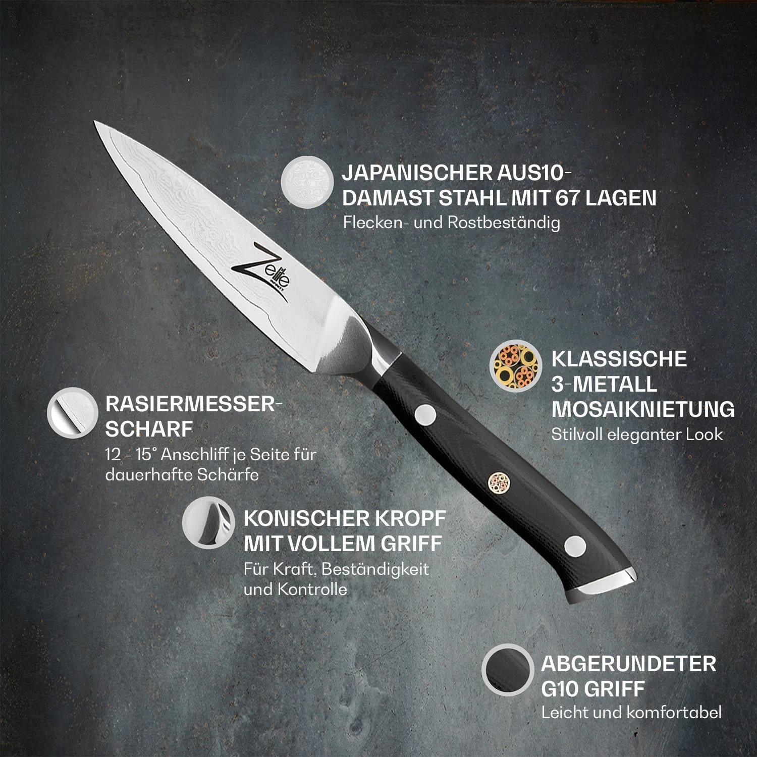 Schälen, Entkernen, Tranchieren oder Putzen von Obst und Gemüse: Diese Aufgaben der Kulinarik sind raffiniert, erfordern Geschick und unbedingt das richtige Instrument. Mit dem 4″ Schälmesser der Alpha-Royal Japanese Serie von Zelite Infinity by Klarstein gehen dir diese und andere Schneidearbeiten reibungslos von der Hand. In deiner Küche wird das kompakte Abziehmesser mit gebogenem Bauch, der besonders feinen Spitze und der geraden Klinge zum Star, selbst beim Formen von ausgefallener Garnitur und bei filigranen Präzisionsarbeiten.