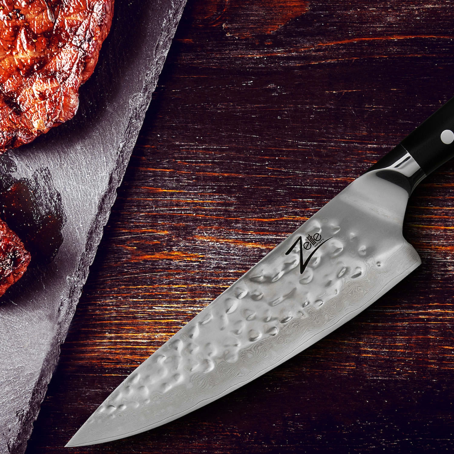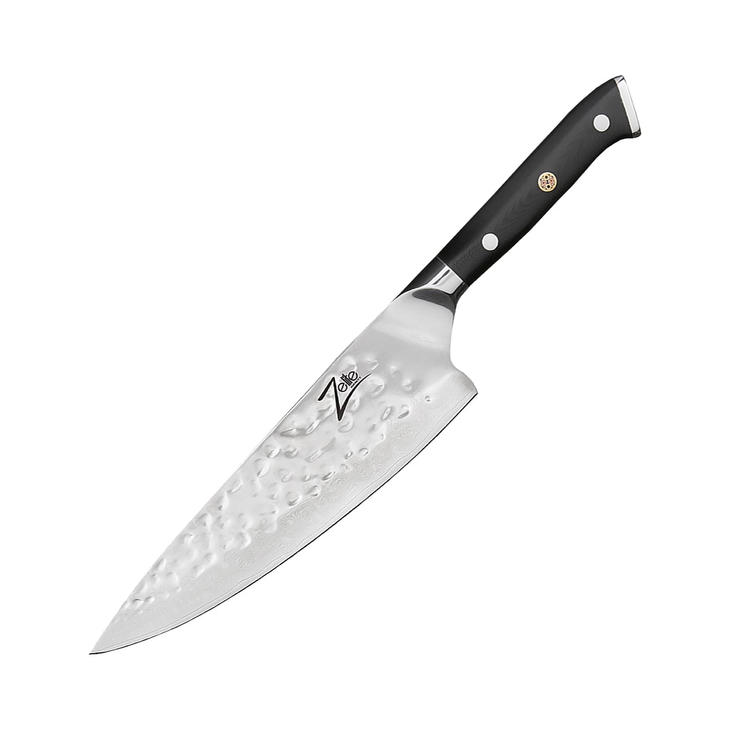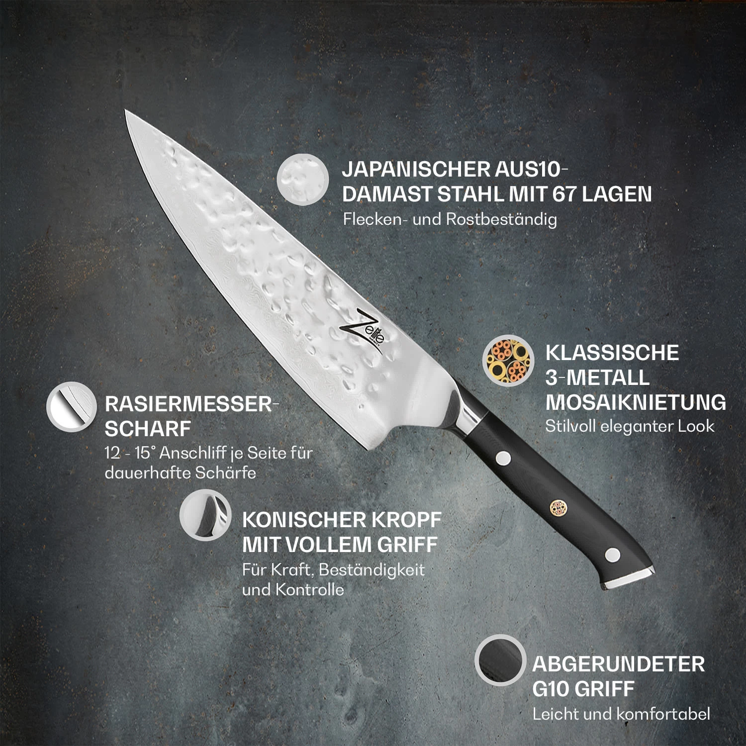 Das 8″ Chefkochmesser der Alpha-Royal Japanese Serie von Zelite Infinity by Klarstein ist eine Weiterentwicklung unseres ursprünglichen Kochmessers. Wir haben unser gehämmertes Tsuchime-Finish über das bereits atemberaubende Damaszener-Muster gelegt, was dem Messer noch mehr Stil und Klasse verleiht. Als eines der vielseitigsten Messer in deiner Küche ist dieses Kochmesser rasiermesserscharf und hat mit 57 mm eine breitere Klinge als dein Standard-Kochmesser. Es ist ideal zum Schneiden von Fleisch, Würfeln von Gemüse, Zerteilen von Obst, Zerkleinern von Kräutern, Hacken von Nüssen und vielem mehr – ein unverzichtbares Werkzeug in deiner Küche.