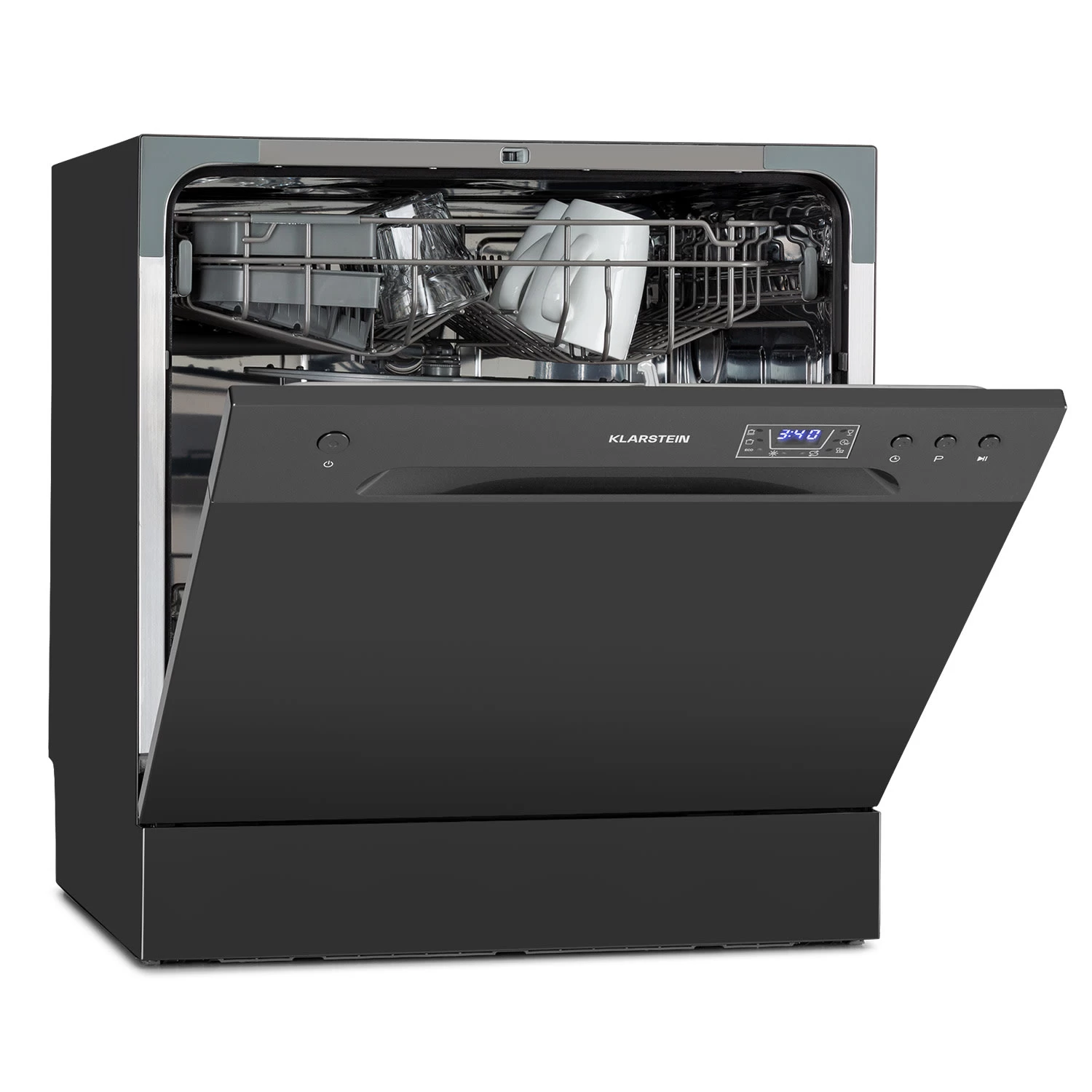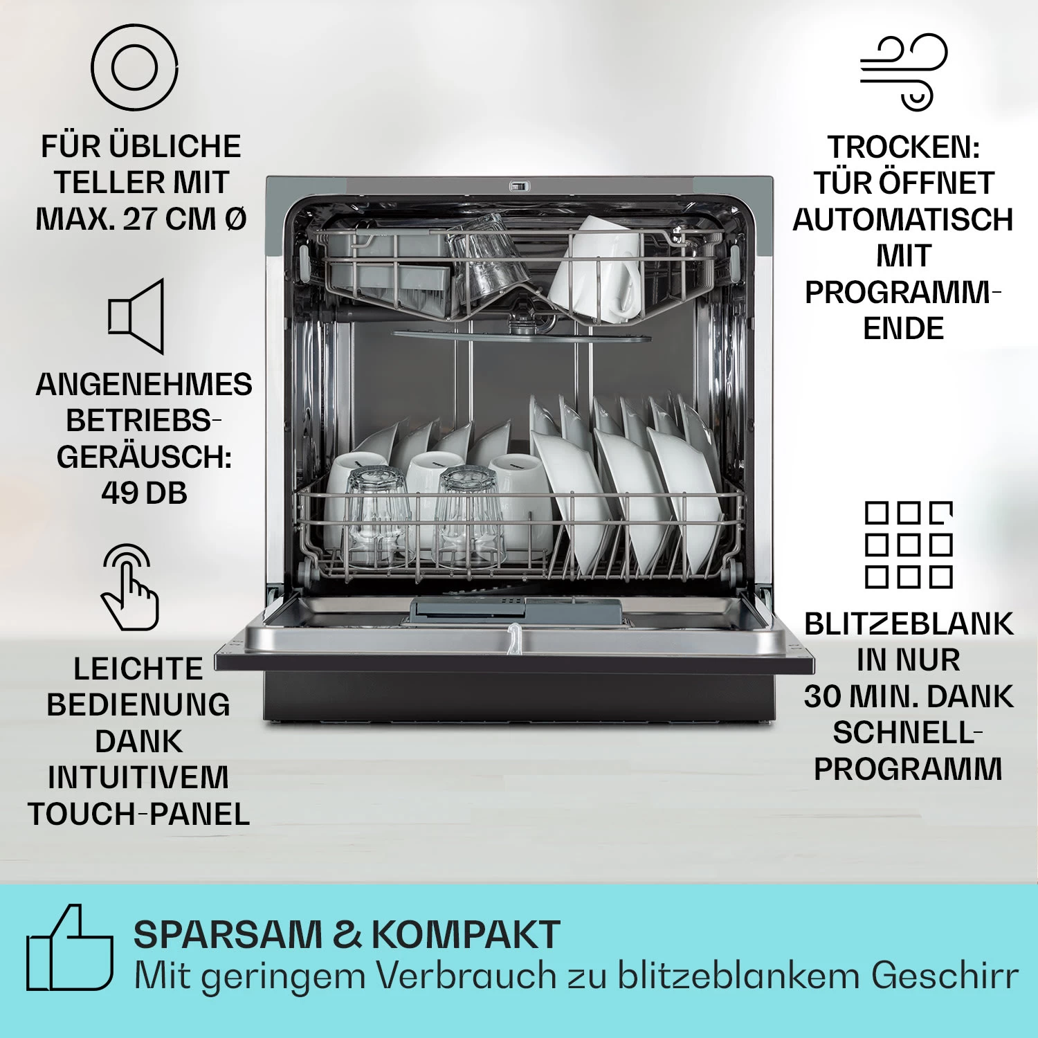 Glasklare Gläser und Geschirr: Der Klarstein Amazonia 8 Geschirrspüler spült zuverlässig im Kleinformat. Er hat ideale Maße für Single-Küchen, Ferienwohnungen oder Wochenendhäuschen! Fast unscheinbar durch seine Größe übernimmt er deinen Abwasch, dabei finden bis zu 8 Maßgedecke gleichzeitig Platz in der modernen Mini-Geschirrspülmaschine. Über das 3-Tasten-Bedienfeld kannst du aus 6 vorteilhaften Programmen wählen – so nimmt es die Amazonia 8 selbst mit starkem Schmutz auf, während sie in der Küche ein wahrer, designstarker Blickfang ist.