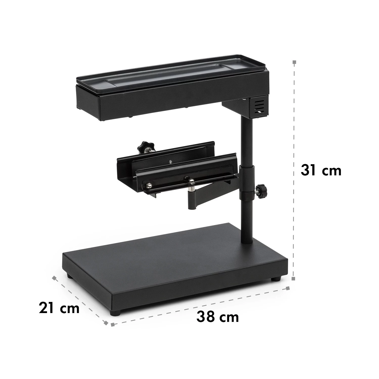 So genießt man Raclette auf traditionelle Art: Edel gereifter Käse, vom Block geschmolzen und auf Baguette, Kartoffeln oder Fleisch verteilt. Dazu wird der Käse direkt im Käseträger eingespannt und unter dem 1000 Watt starken Heizelement positioniert. Per Höhenverstellung bestimmt man unkompliziert, wie schnell der Käse eine cremige Konsistenz erlangt. Der Käseträger lässt sich zudem seitlich schwenken sowie horizontal kippen, um den Käse ganz einfach und komfortabel auf dem jeweiligen Teller zu verteilen. Natürlich kann die Heizleistung über den integrierten Thermostatschalter eingestellt werden: Wer den Käse lieber dunkler mag, stellt die Temperatur einfach höher ein.
