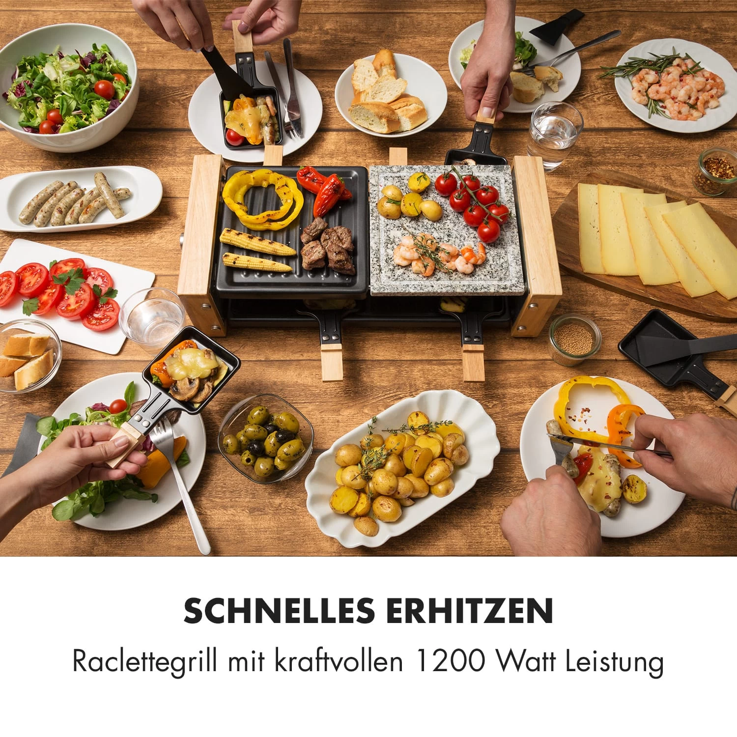 Leistungsstark mit 1200 Watt bringt der Klarstein Chateaubriand Nuovo Raclettegrill Käse zum Schmelzen, bräunt Fleisch und gart Gemüse oder Pilze in Rekordzeit. Die Temperatur ist ganz einfach stufenlos per Thermostat regulierbar. Dabei wird dank des Aufbaus in zwei Etagen drunter und drüber gegrillt. Während unten die 8 Stahlpfännchen mit non stick-coating zum Überbacken mit Käse genutzt werden, wird oben ordentlich den Grillplatten eingeheizt. Davon stehen gelich zwei zur Verfügung: Einmal eine antihaft-beschichtete Aluminiumplatte und einmal eine Natursteinplatte aus poliertem Granit. Beide bieten mit 19,5 x 18 cm Größe genug Platz zum Grillen für alle am Tisch. Während die Metallgrillplatte die Hitze gleichmäßig und schnell an das Grillgut weitergibt und dank der Antihaftbeschichtung besonders wenig Fett zum Grillen benötigt, glänzt der Naturstein mit seiner langen Wärmespeicherung, um auch nach dem Ausschalten noch lange nachzuheizen. Letztere bietet sich darüber hinaus an, Mini-Pizzen und andere Teig-Kleinteile zu backen. Zum einfachen Wenden auf dem Grill und dem Entleeren der Pfännchen wird jeder Grillmeister mit einem von 8 Kunststoff-Spachteln ausgerüstet. Da das Auge bekanntlich mit isst, wurde das Gehäuse mit einem edlen Dekor aus Holz versehen – das zugleich als CoolTouch-Griff an den Pfännchen dient.