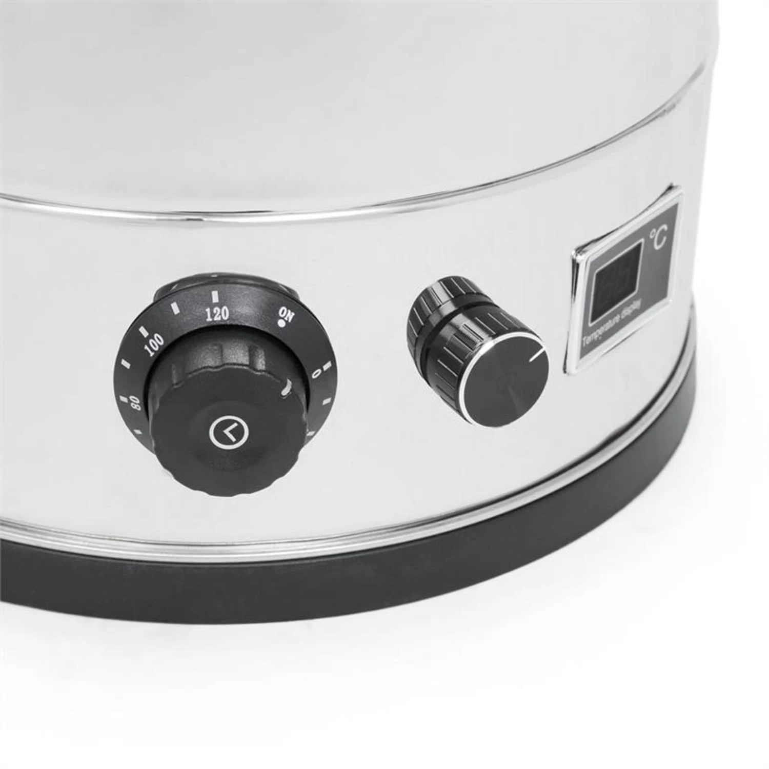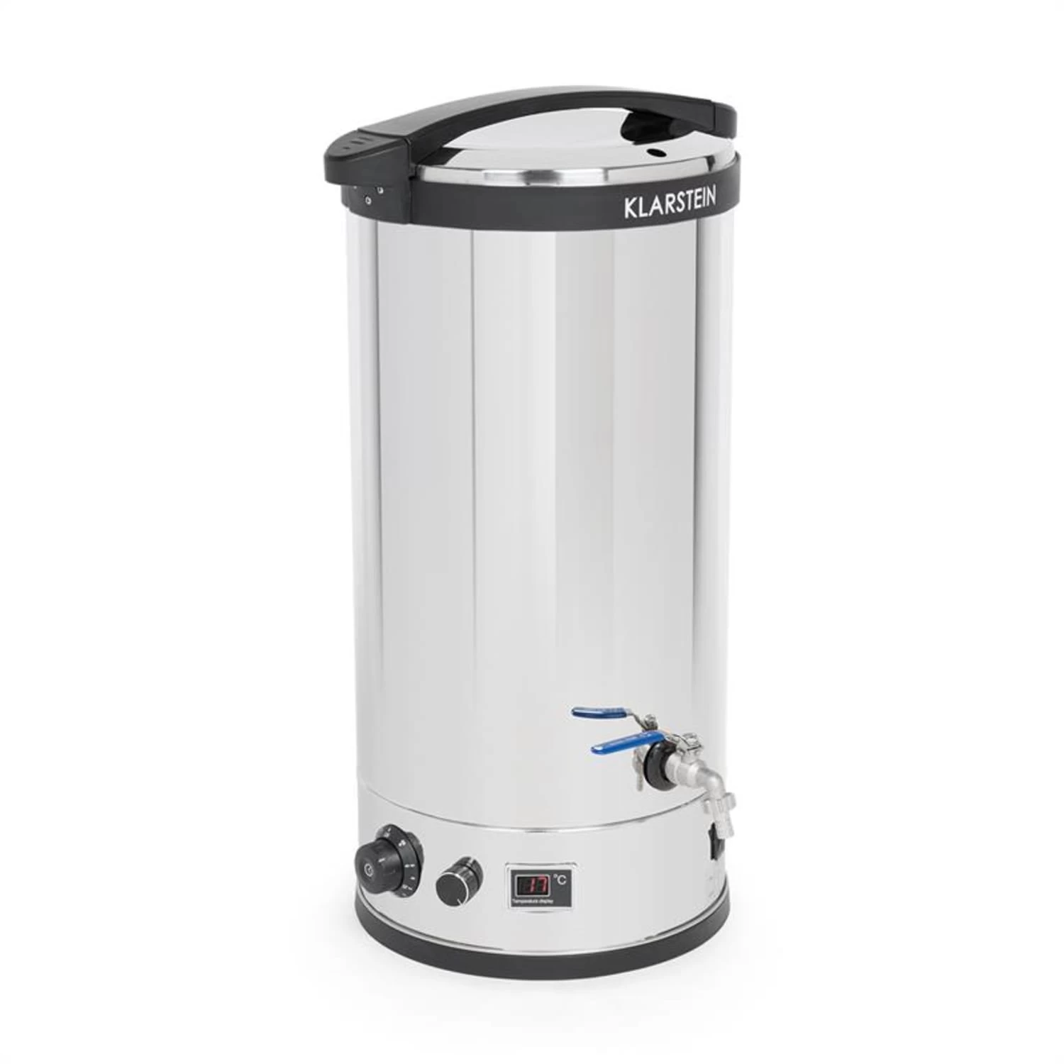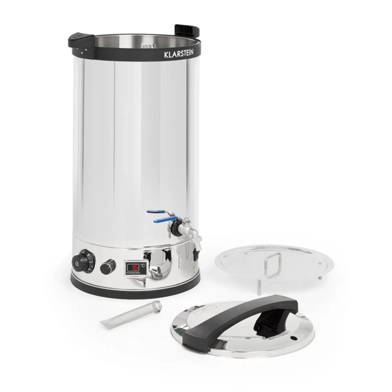 Egal ob Einsteiger oder versierter Hobby-Brauer, der Klarstein Füllhorn Maischekessel macht das Ansetzen der Braumaische zum Kinderspiel. Bis zu 30 Liter Braugut können in dem doppelwandigen Edelstahlkessel zum Kochen gebracht werden. Über zwei Drehregler mit LED-Display lassen sich manuell Temperatur und Kochzeit genau einstellen. Das 2500 W starke Heizelement bringt die Maische in Wallung. Es erreicht die gewünschten Temperaturen praktisch im Handumdrehen und hält sie dann über Stunden hinweg bei konstanten Temperaturen. Für sparsamen Energieverbrauch kann dann – je nach Füllstand des Kessels – die Leistung auf 900 oder 1600 Watt verringert werden. Eine 15-mm-Öffnung im Deckel kann zum Anschluss einer Umwälzpumpe genutzt werden.