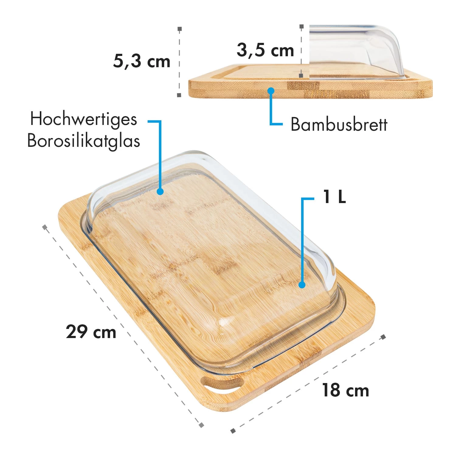 - Material: Borosilikatglas und Bambusholz