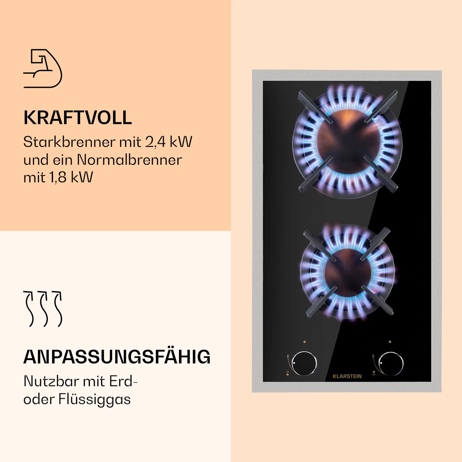 Goldflame Domino Prime Gaskochfeld 2-flammig Messing-Brenner Glaskeramik