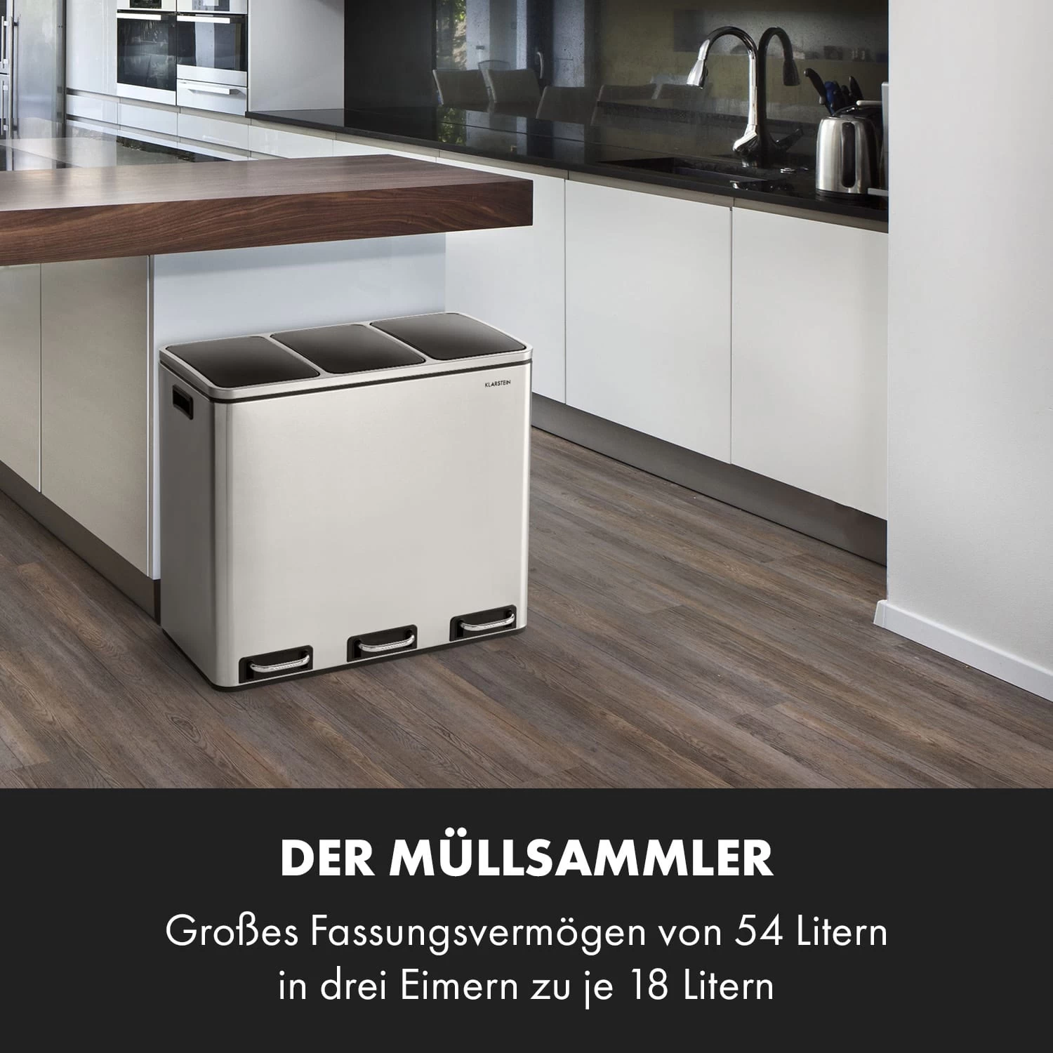 Dafür bietet der Klarstein Grandmaster Trash Mülleimer in seinem voluminösen Innenraum nicht nur einen, sondern gleich drei Behälter zum Sortieren der Abfälle – so macht Mülltrennung richtig Spaß. Drei einzeln herausnehmbare Eimer aus bruchresistentem PP-Kunststoff mit jeweils 18 Liter Fassungsvermögen verbergen sich im 54 Liter großen Mülltrenner und warten auf die Fütterung mit anfallenden Abfällen. Per Tretöffnung schnellen die Klappen der einzelnen Eimer nach oben und präsentieren so ihre Einwurföffnung. Ist der Müll im Eimer schließen sich die Klappen geräuschlos wieder. An einem verchromten Metall-Henkel kann jeder Eimer einzeln entnommen werden, wenn er seinen Füllstand erreicht und Entleerung benötigt. Für ein einheitliches, edles Bild sorgt das Außengehäuse aus Edelstahl mit gebürsteter Oberfläche.