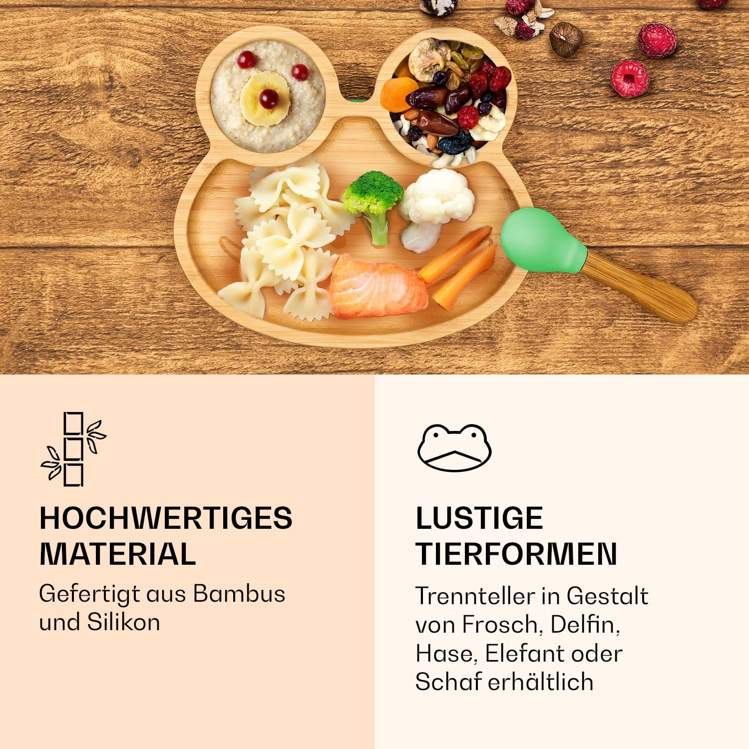Spiel und Spaß beim Essen! Das Kindergeschirr mit Bambusteller und Löffel von Klarstein ist nahezu unverwüstlich! Dafür sorgen das robuste Bambus-Material und der Silikon-Saugnapf, der den Essteller am Tisch befestigt. Besonders viel Freude bei den kleinen Gourmets bereiten aber die lustigen Tierformen des Tellers: Mit Frosch, Hase, Schaf, Elefant oder Delfin isst es sich gleich viel interessanter! Alle Trennteller sind aus Bambus gefertigt und enthalten keine Chemikalien oder Schadstoffe. Qualitätskontrollen versichern außerdem, dass sie keinen Eigengeruch oder Eigengeschmack an die Nahrung abgeben. Du kannst sie somit jederzeit mit heißen wie kalten, festen wie flüssigen Lebensmitteln befüllen. Das motivierende Lernbesteck – bestehend aus einem Teller und einem farblich passenden Löffel – ist eine tolle Geschenkidee für frisch gebackene Eltern und ihren kleinen Nachwuchs.