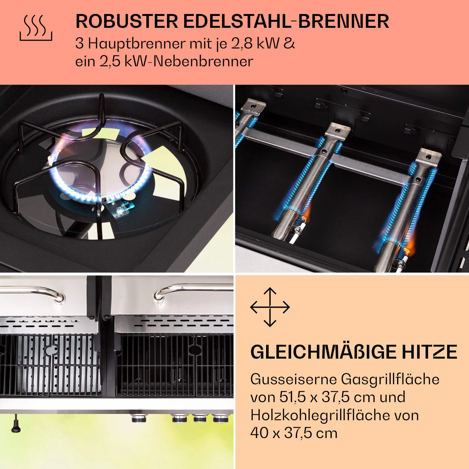 Mit Holzkohle oder Gas ist der 2-in-1-Grill für jeden Anspruch bereit. Drei Haupt- und ein Seitenbrenner aus Edelstahl mit einer Gesamtleistung von 10,9 kW sorgen dafür, dass verschiedenste Speisen außergewöhnlich gut gegrillt werden. Auf der Gasgrillfläche von 51,5 x 37,5 cm werden besonders Steaks und andere Fleischspezialitäten hervorragend auf den Punkt zubereitet. Für besonders ursprünglichen Grillgenuss bietet der Kombigrill auf der linken Seite die Möglichkeit, mit Holzkohle auf 40 x 37,5 cm Fläche ein zünftiges BBQ zu veranstalten. Beide Grills verfügen über doppelwandige Deckel aus Edelstahl mit integrierten Thermometern für passives Grillen von Pulled Pork und ähnlichen Spezialitäten.