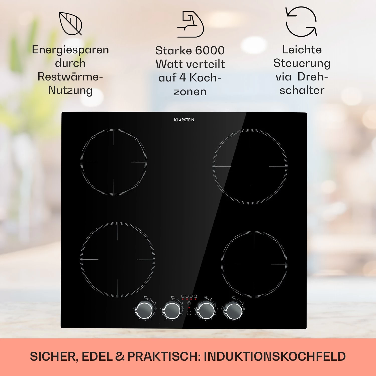 Das Klarstein Kochheld Einbau-Induktionskochfeld ist ein echtes Powerpaket: Es bringt mit seinen vier Kochfeldern satte 6000 Watt Leistung in deine Küche und überzeugt mit seinem schlichten, schwarzen Design und den Dreh-Reglern jeden Kochmuffel.