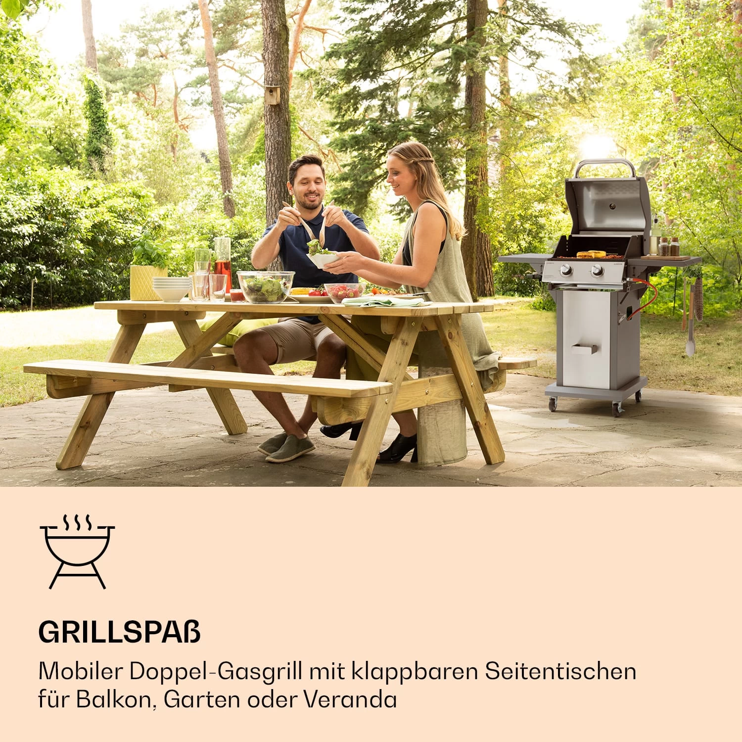 Anzünden, Auflegen, Lecker! Für gemütliche Grillabende in geselliger Runde sorgt der Klarstein Lucifer 2 Gasgrill mit 2 Brennern. Dabei strahlt er mit seinem klaren Design, der Grillplatte und den klappbaren Seitentischen aus Edelstahl einen modernen, warmen Charme aus.