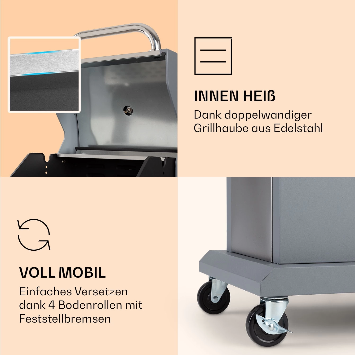 Nach dem Grillen ist vor dem Grillen, darum sind die Edelstahl-Oberflächen besonders einfach zu reinigen. Dank leichtgängiger Bodenrollen mit Feststellbremse ist der Klarstein Lucifer 2 Gasgrill auch ganz schnell weggeräumt – so macht Grillen auch am Tag danach noch Spaß!