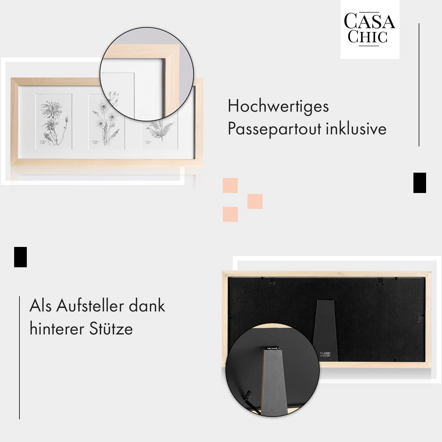 Gestalte dein Zuhause bunt und lebendig: Der besondere Moorgate Bilderrahmen von Casa Chic by blumfeldt fügt gleich drei Bilder gleichzeitig in seinem edlen Echtholzrahmen zusammen. Das hochwertige Passepartout sorgt dabei für einen gleichmäßigen Abstand. Alternativ kannst du auch Panorama- oder Hochformat-Aufnahmen mit dem Moorgate rahmen und wunderbar in Szene setzen. Dabei macht er als Aufsteller auf dem Sideboard, im Regal oder als Wandbilderrahmen eine gute Figur und umschließt mit seinem schlichten Rahmenprofil und der bruchsicheren Frontscheibe aus Acrylglas deine schönsten Erinnerungen.
