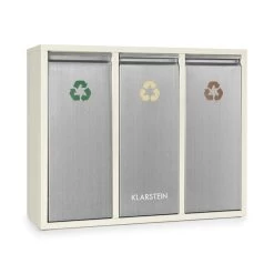Der Klarstein Ordnungshüter 3 Mülleimer bietet nicht nur einen, sondern gleich drei Behälter zum Sortieren der Abfälle – so macht Mülltrennung richtig Spaß. Im Inneren des 45 Liter großen Mülltrenners warten 3 stabile Eimer aus PE-Kunststoff auf die Fütterung mit anfallenden Abfällen: Farblich in Gelb, Grün und Braun gekennzeichnet, fällt es auch fachfremden Entsorgern ganz leicht, zu erkennen, in welchen Eimer Recyclingmaterial für die Gelbe Tonne, Kompostierbares für den Biomüll und Restmüll hinein gehören. Per Frontklappenöffnung kippen die Eimer zur Befüllung nach vorn und präsentieren so ihre Einwurföffnung. Am verchromten Metall-Henkel kann jeder Eimer einzeln entnommen werden, wenn er seinen Füllstand erreicht und Entleerung benötigt. Für ein einheitliche Bild und zusätzliche Stabilität sorgt das Außengehäuse aus pulverbeschichtetem Edelstahl. Damit die Mülltrennung ohne Bücken stattfindet, lässt sich der Ordnungshüter 3 in bequemer Zugriffshöhe an die Wand hängen. Dank seiner Frontklappen aus gebürstetem Edelstahl und dem cremebeigen Gehäuse macht er dort auch eine ansprechende Figur, die nichts von seinem schmuddeligen Innenleben ahnen lässt.