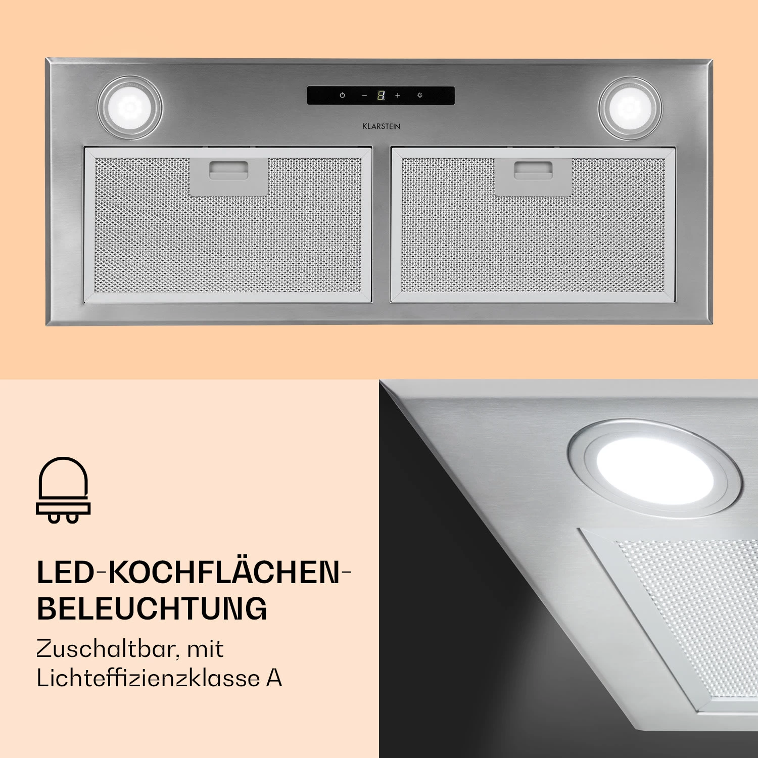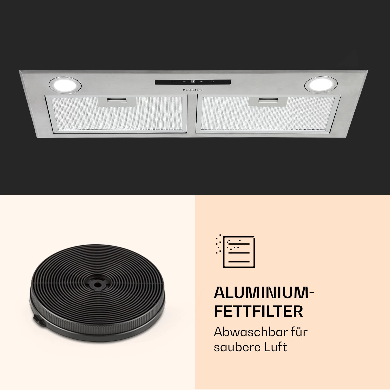 Beste Luft in der Küche: Die Klarstein Paolo Dunstabzugshaube verschwindet randlos in der Küchenhänge. Von dort beseitigt sie schwungvoll Dampf und Dunst beim Kochen – mit 200 Watt Motorleistung, drei Geschwindigkeiten und bis zu 593 m³/h Abluftleistung. Per unkomplizierter Touch-Bediensektion kannst du Lüftung und Beleuchtung steuern und ein Abschalttimer lüftet auf Wunsch für 1 bis 9 Minuten nach und schaltet das Gerät danach ab.