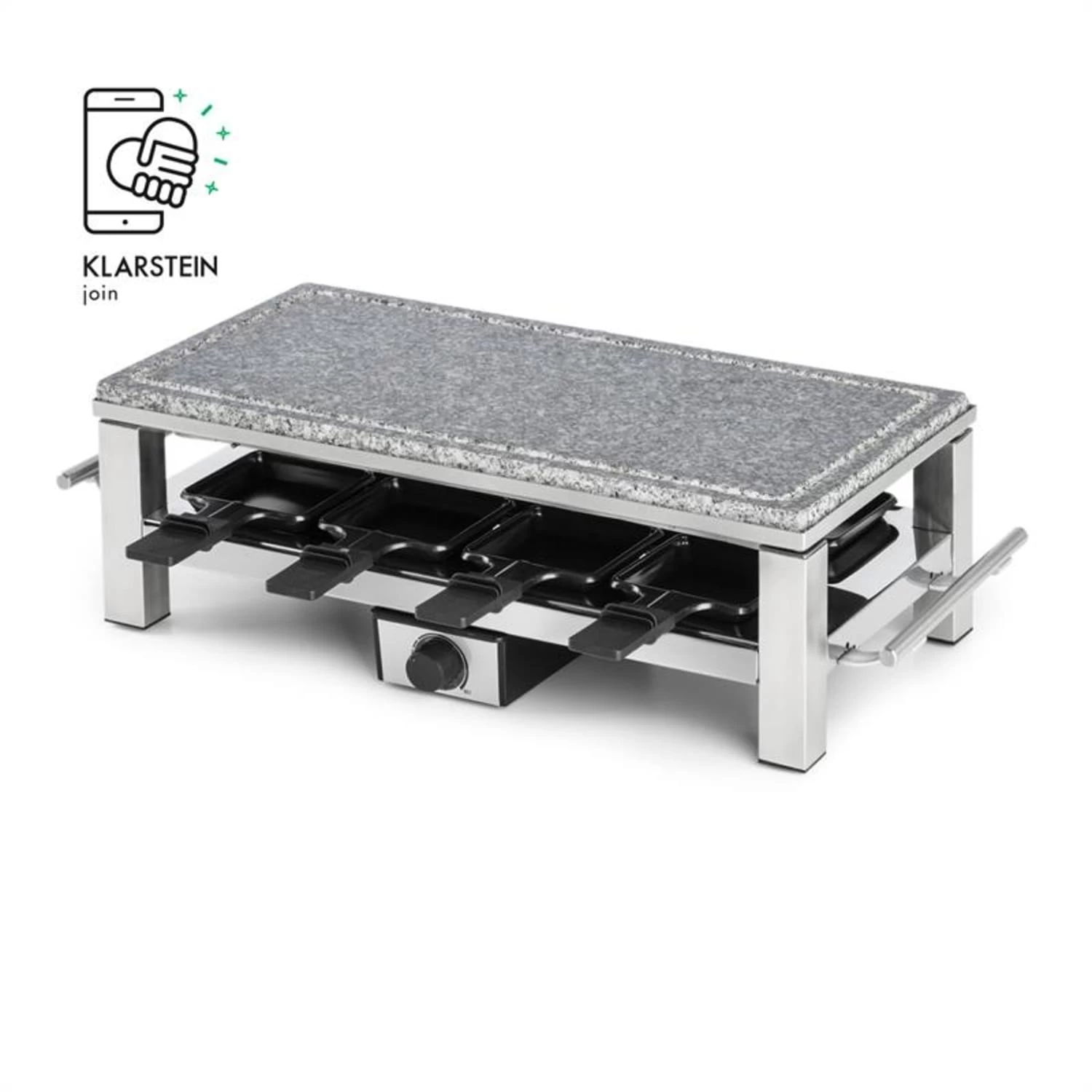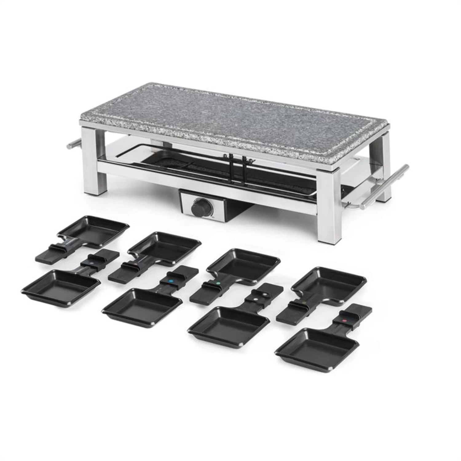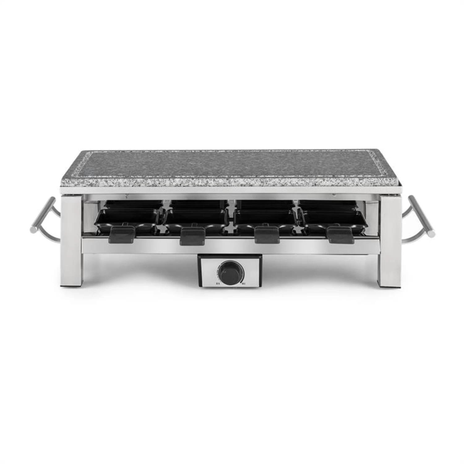 Dank der kraftvollen Leistung von 1500 Watt ist das Schmelzlette Raclette schnell aufgeheizt. Die Wärme wird in der kratzfesten Natursteinplatte aus Granit lange gespeichert, wodurch das Grillgut äußerst schonend gegart wird. Im unteren Bereich des Gehäuses lassen sich bis zu 8 Pfännchen positionieren, deren jeweiliger Inhalt sich durch ihre Antihaftbeschichtung schnell und mühelos entnehmen lässt. Die Temperatur ist ganz einfach stufenlos per Thermostat regulierbar. Ein hitzebeständiges Gehäuse und die seitlichen Griffe aus Edelstahl sind nicht nur hochwertig, sondern auch praktisch.
