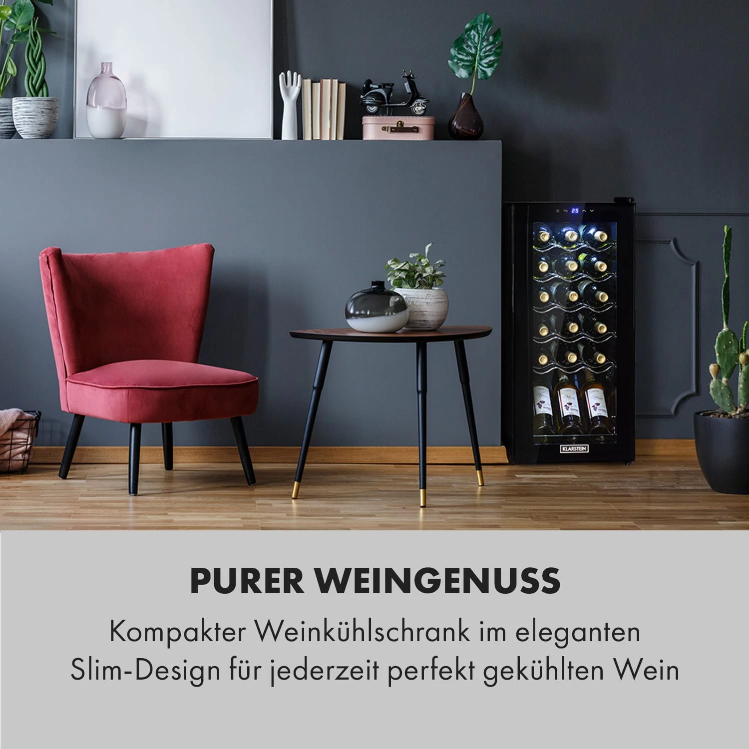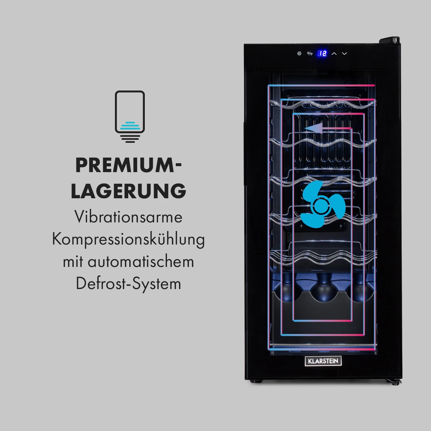 Aus Liebe zum Wein: Der Klarstein Shiraz 18 Slim Uno Weinkühlschrank sorgt für besten Weingenuss, indem er Weinflaschen die richtige Trinktemperatur verschafft. Dabei glänzt er mit seinem Slim-Design und schmiegt sich auch in kleine Lücken wundervoll ein. Bis zu 18 Flaschen Wein kannst du mit ihm optimal lagern und auf eine Trinktemperatur zwischen 5 und 18 °C kühlen. Die Fronttür aus Sicherheitsglas ermöglicht dir dabei eine wundervolle Präsentation der edlen Flaschen.