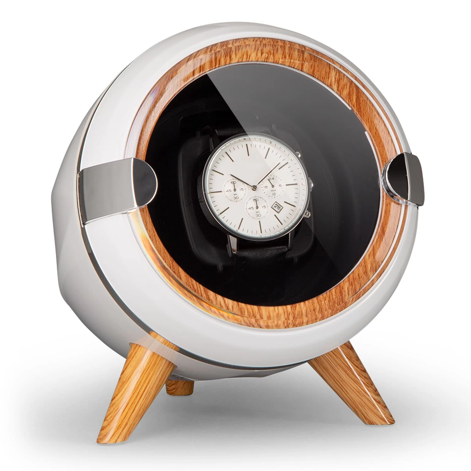 Als Uhrenaufnahme dient ein edles schwarzes Samtkissen, dass jede Uhr elegant in Szene setzt. Auch Uhren mit einem langem Band finden festen Sitz durch eine aufsteckbare Erweiterung. Eine Klarsichtabdeckung schützt den wertvollen Chronometer vor Staub und Schmutz. Zur Rotation der Uhr stehen vier Modi zur Auswahl, die sie mit unterschiedlichen Intervallen entweder links- oder rechtsherum oder in wechselnder Drehrichtung in Bewegung halten. Insgesamt kann die Uhr entweder mit 650, 900, 1200 oder 1500 Umdrehungen pro Tag rotiert werden.
