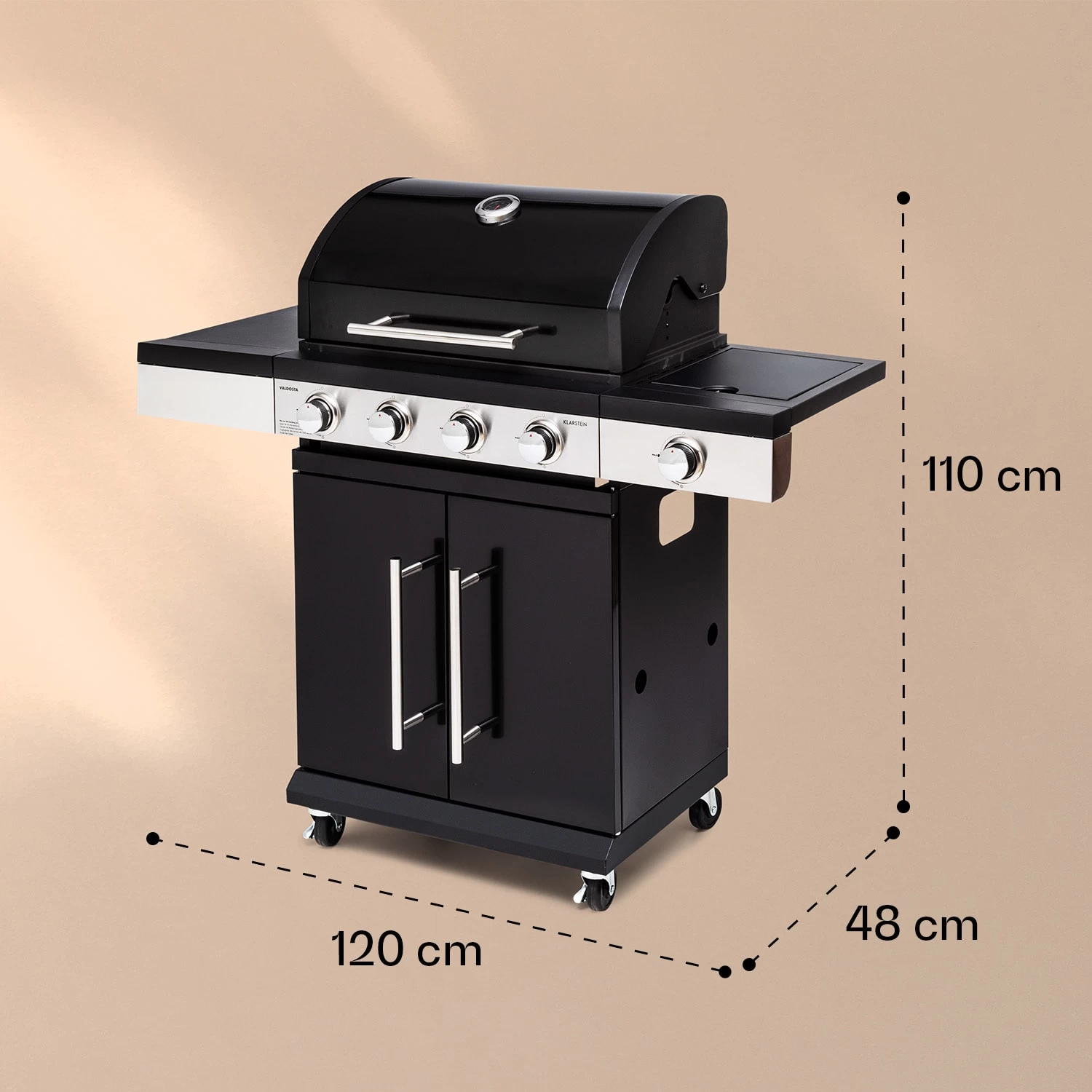 Die Grillsaison kann kommen! Kompakte Größe, beachtliche Grillfläche, starke Hitzeleistung und zeitloses Design machen den Klarstein Valdosta 4.1 Gasgrill zum Grillhelden im Garten. Vier kraftvolle Edelstahlbrenner mit jeweils 2,8 kW Hitzeleistung und ein praktischer Seitenbrenner mit 2,5 kW brutzeln Burger, Steaks, Gemüse oder Fisch in Rekordzeit. Die praktische Grillhaube mit Thermometer ermöglicht dir außerdem die Freuden des passiven Grillens von Spezialitäten wie Pulled Pork. Doch nicht nur die Leistung des Klarstein Valdosta 4.1 Gasgrills überzeugt, sein rustikales Design in Edelstahl macht dich zum Chef an der BBQ-Front.
