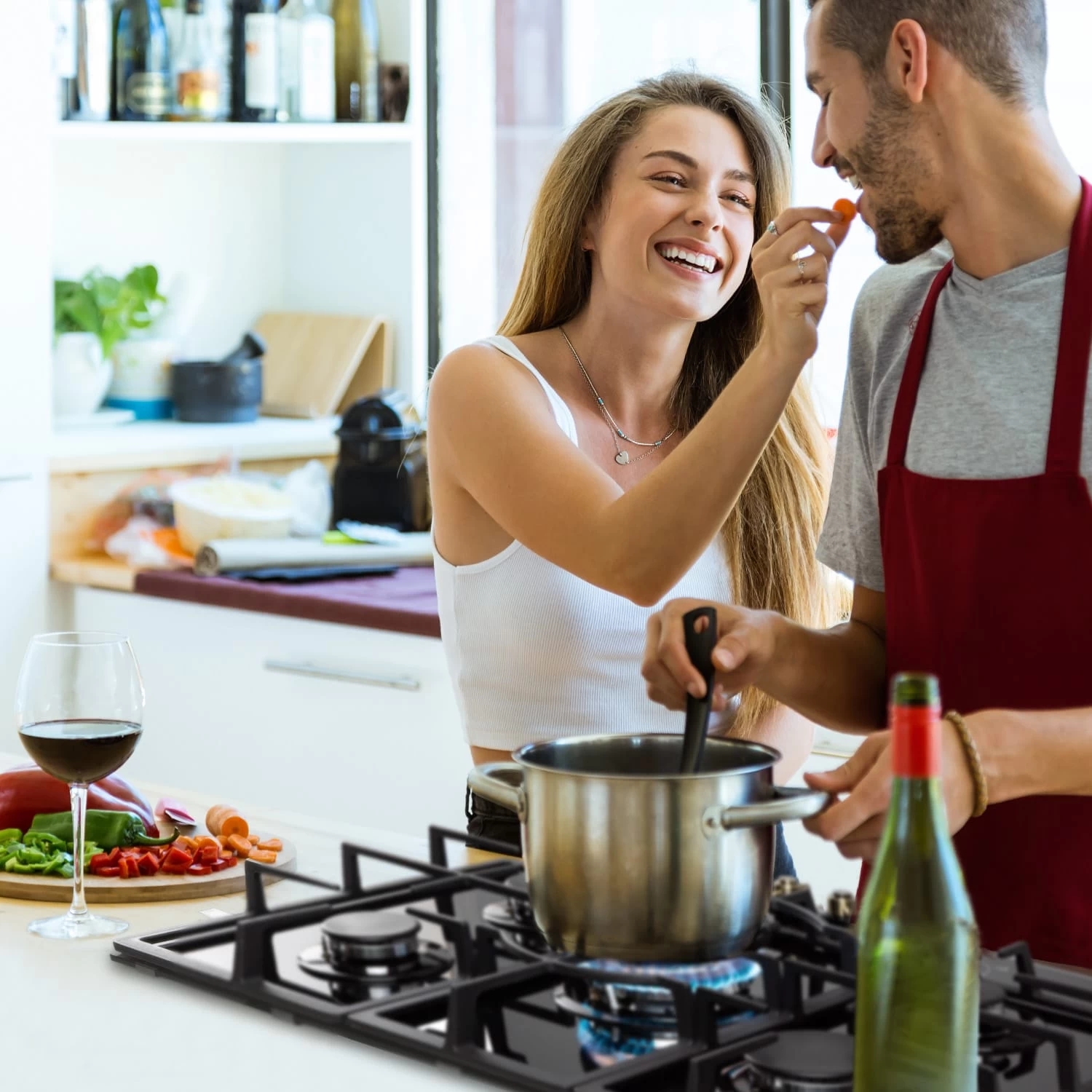 Auf dem geräumigen Klarstein Victoria 5 Gaskochfeld befinden sich fünf hochwertige Sabaf-Brenner, die mit einer Leistung von jeweils 3,6 kW, 3,0 kW und 1 kW sowie zweimal 1,75 kW ordentlich einheizen. Durch seine unterschiedlichen Brenner-Größen ist das Victoria 5 für jede erdenkliche Mahlzeit geeignet – dabei verteilen die Brenner die Hitze gleichmäßig in der Mitte und an den Rändern deines Kochgeschirrs, so wird alles perfekt gegart. Die Bedienung ist dank der selbsterklärenden Symbole an den großen im Retro-Design gestalteten Drehknöpfen absolut intuitiv, die Hitzezufuhr kann während des Kochvorgangs immer wieder direkt angepasst werden. Via SnapJetIgnition entzündest du die Flamme, somit ist kein zusätzliches Feuer nötig. Die drei abnehmbaren Kreuze aus massivem Gusseisen sitzen passgenau und kippsicher über den Flammen. Das Kochfeld ist mit einer gehärteten, pflegeleichten Keramikglas-Beschichtung versehen, die nicht nur gut aussieht, sondern auch besonders leicht zu reinigen ist.