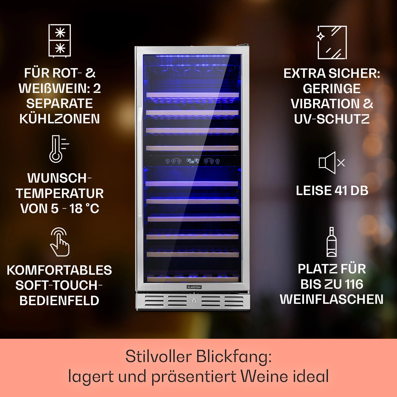 Edles Design, welches deine Weinvorräte mit Klasse und Stil inszeniert: Der Klarstein Vinovilla Grande 116 Built-in Duo Zwei-Zonen-Weinkühlschrank ist eine designstarke Augenweide an jedem Ort. Dabei besticht er auch durch eine raffinierte Funktionalität: Dank den zwei Kühlzonen mit unterschiedlich regulierbarer Temperatur kannst du rote und weiße Weine zeitgleich kühlen und lagern. Denn erst mit der richtigen Kühltemperatur entfalten edle Tropfen ihr volles Aroma. Für perfekten Weingenuss sorgen hier zudem die vorgekühlten Gläser.