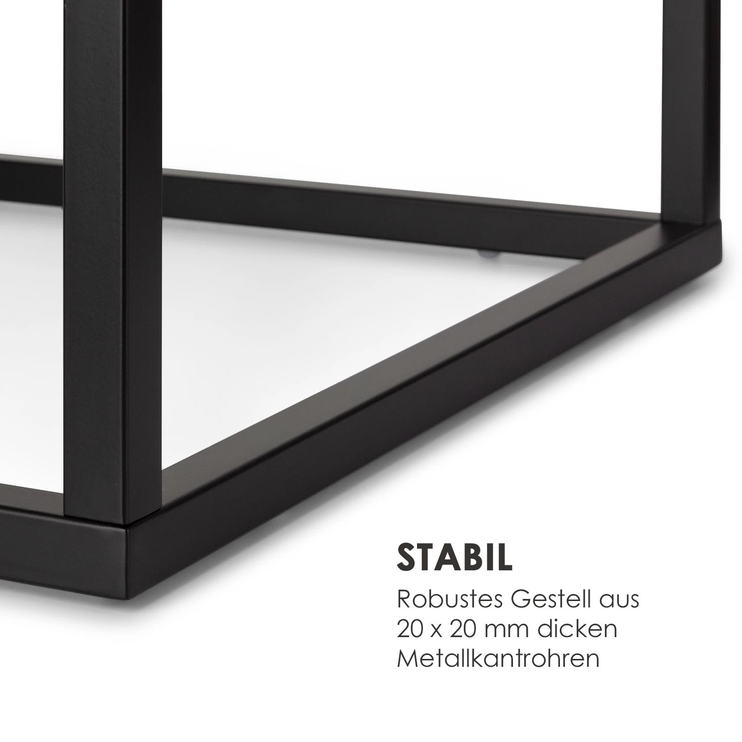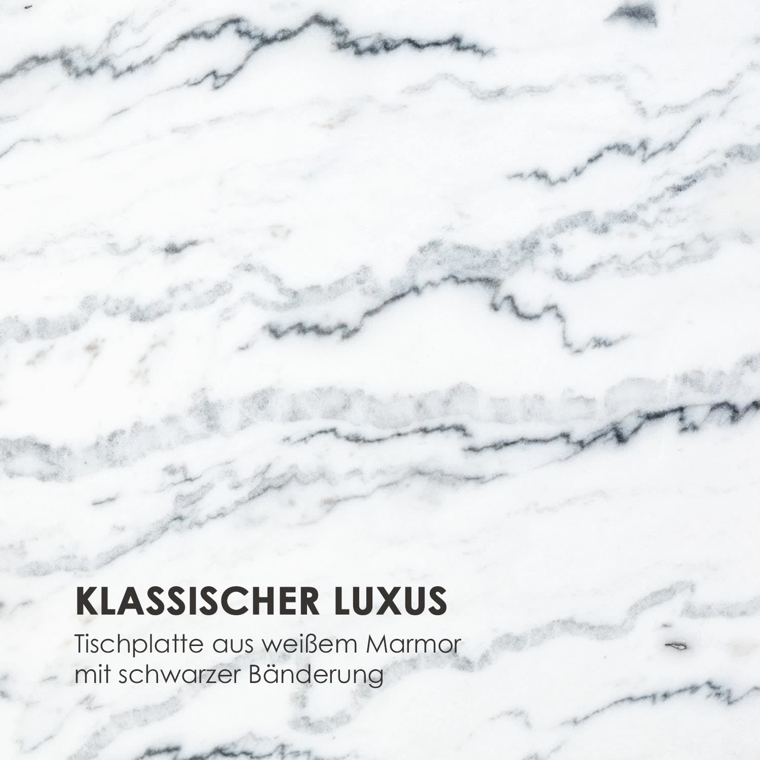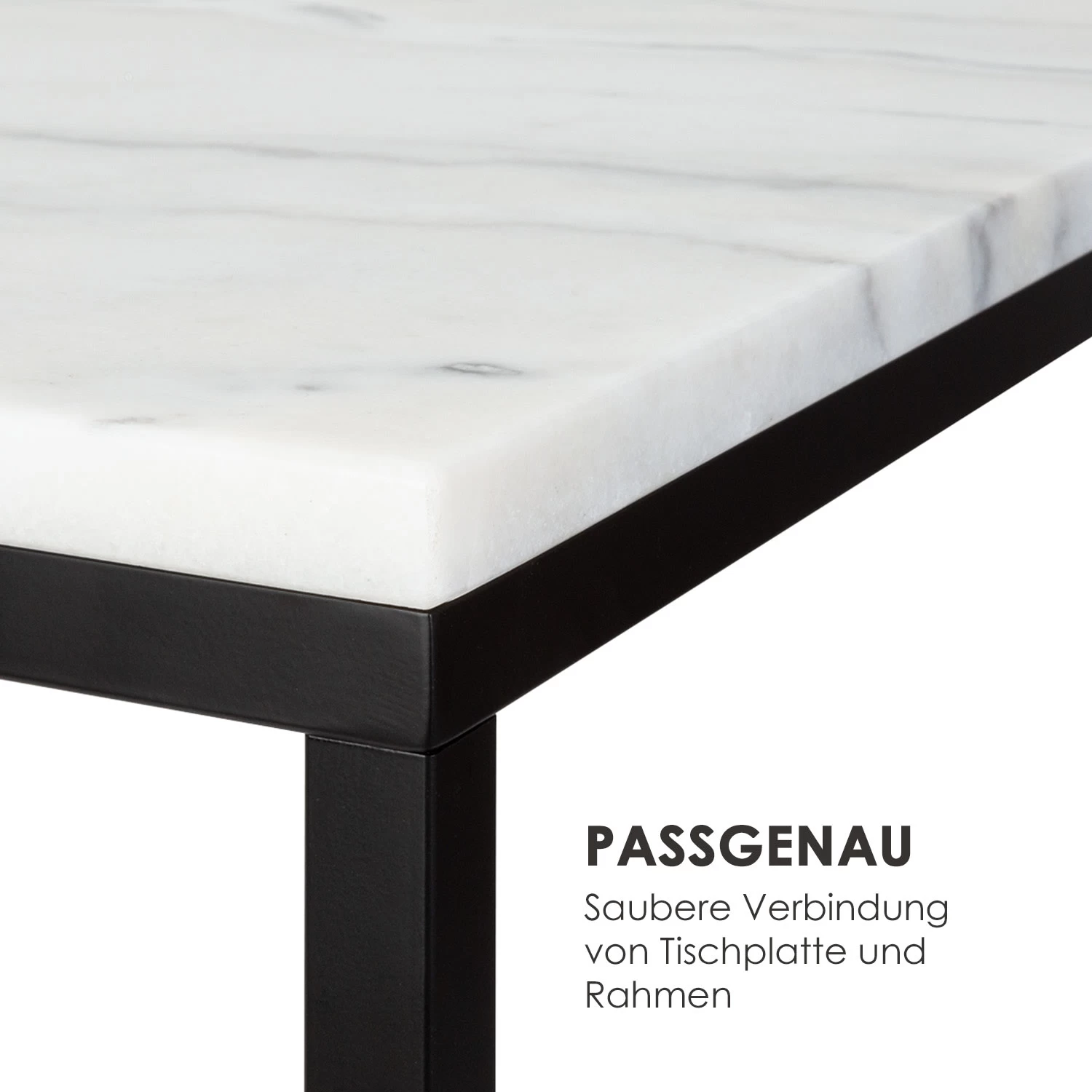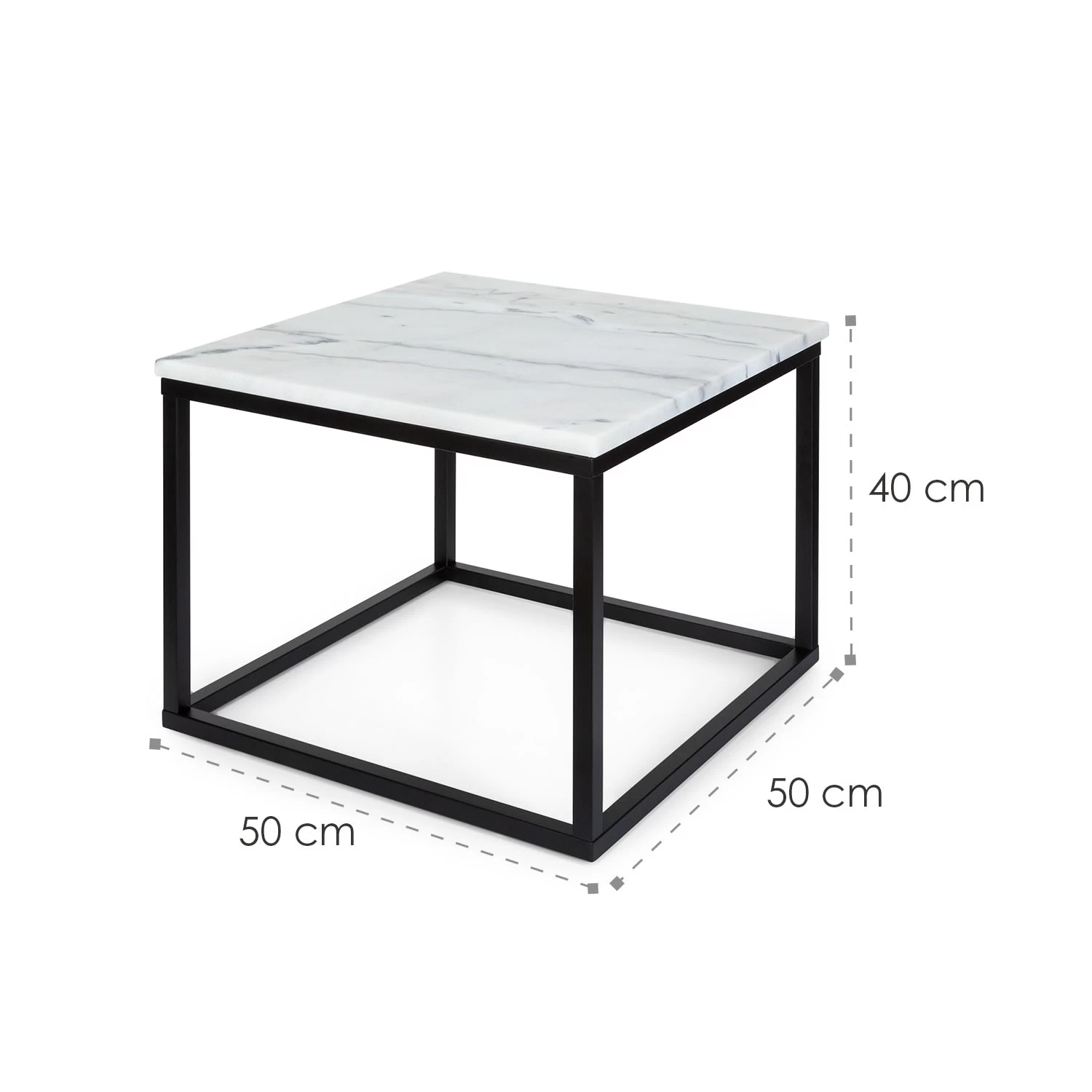 Zeitlose Eleganz für drinnen und draußen ist der Anspruch des Besoa Volos T50 Beistelltisches. Seine glatt polierte Tischplatte aus weißem Marmor mit schwarzer Bänderung erweckt den Luxus des Sonnenkönigs bei dir zuhause. Zusätzlich unterstrichen und stabil gehalten wird die edle Tischplatte durch das schwarze Metallgestell aus 20 x 20 cm dicken Rohren. Doppelt schützt besser, deswegen ist der Rahmen des Volos elektrostatisch und pulverbeschichtet. Das verleiht dem Rahmen hohe Witterungsunempfindlichkeit gegen Frost und Wasser – so kann der Volos T50 auch problemlos auf dem Balkon, der Terrasse oder im Garten genutzt werden. Dabei bleibt der Couchtisch in seiner Formensprache modern und schnörkellos, sodass er sich perfekt in dein Wohnambiente einfügt. Mit seinen praktischen Maßen von 50 x 40 x 50 cm eignet sich der Volos T50 ideal als Couch- oder Beistelltisch.
