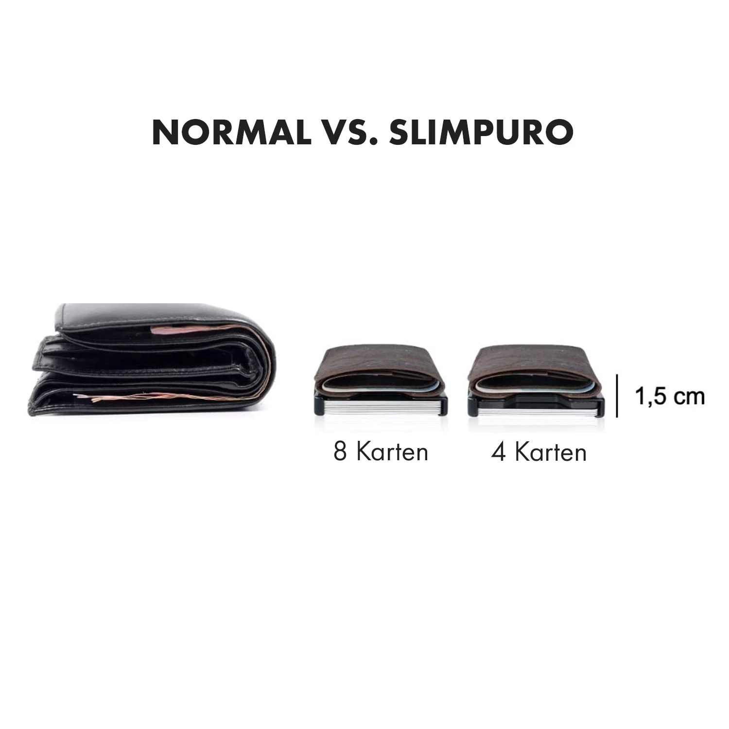 Keine Lust mehr auf große, unhandliche und unsortierte Portemonnaies? Mit dem ZNAP Slim Wallet von slimpuro schrumpft deine Geldbörse auf 8 x 1,5 x 6 cm (BxHxT) zusammen. Natürlich hast du weiterhin Platz für bis zu 8 Karten sowie Geldscheine und Münzen. Das Mini-Portemonnaie mit seinem robusten Case aus Aluminium und einer RFID Schutz Karte schützt deine Bankkarten vor Datendiebstahl. Im hochwertigen Geldscheinfach finden – ungefaltet – Banknoten bis 200 Euro Platz. Mit seinen vielen unterschiedlichen Farben und Designs findet jeder sein passendes ZNAP Slim Wallet.
